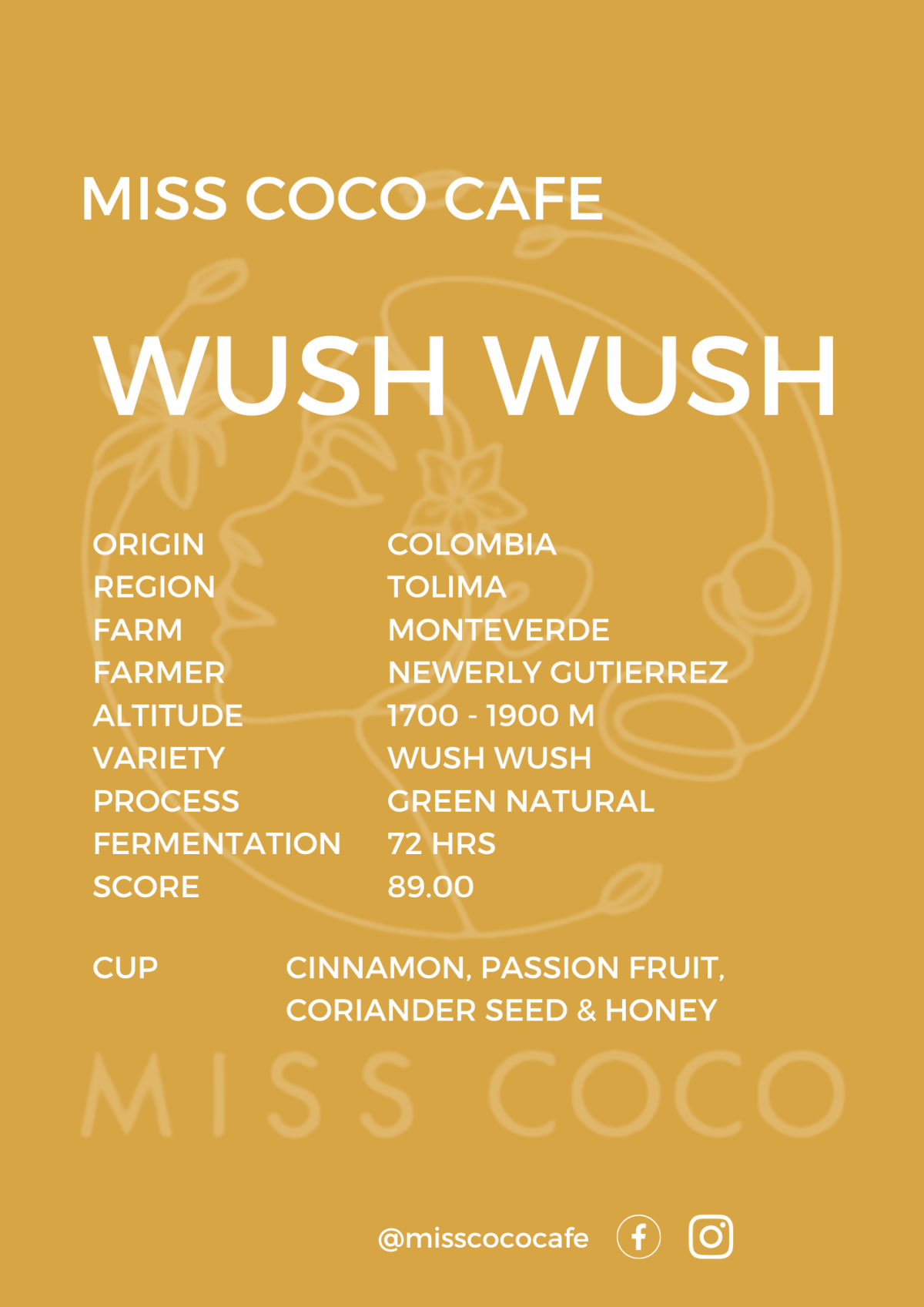 Explore the Monteverde Wush Wush Green Natural, an 89-point specialty coffee from Tolima, Colombia. Grown at 1,700–1,900m by Newerly Gutierrez, this rare Wush Wush variety undergoes a unique 72-hour green natural fermentation, developing a bold and exotic profile. Expect rich notes of cinnamon, passion fruit, coriander seed, and honey. Available in whole bean or customized grind sizes.